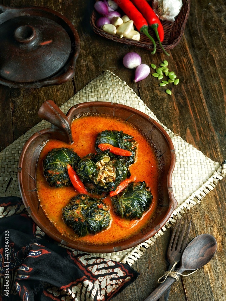 Buntil Daun Pepaya Jepang A Traditional Indonesian Dish From Central Java Filled With A Mixture Of Grated Coconut Anchovies Lamtoro And Spices Wrapped In Papaya Leaves In A Spicy Coconut Sauce Stock